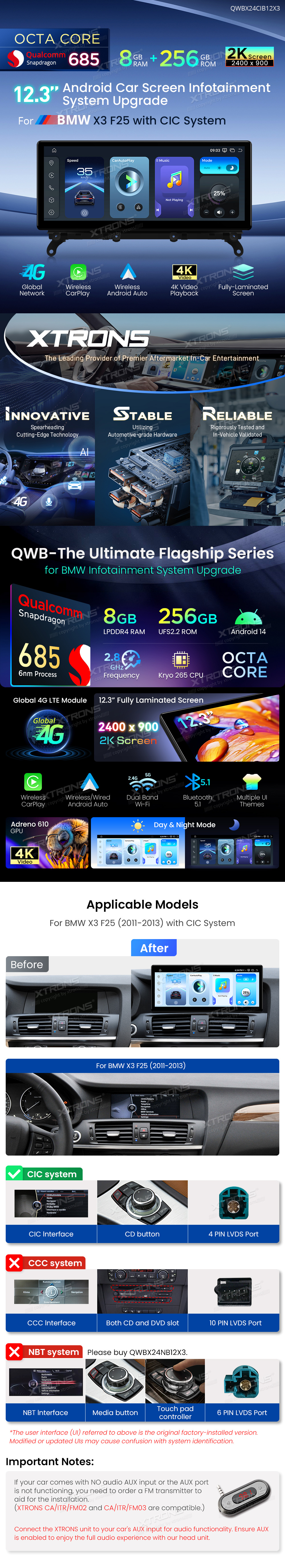12.3 Inch 2K Screen Qualcomm Snapdragon 685 8+256GB Android Car Screen Infotainment System Upgrade for BMW X3 F25 With CIC System