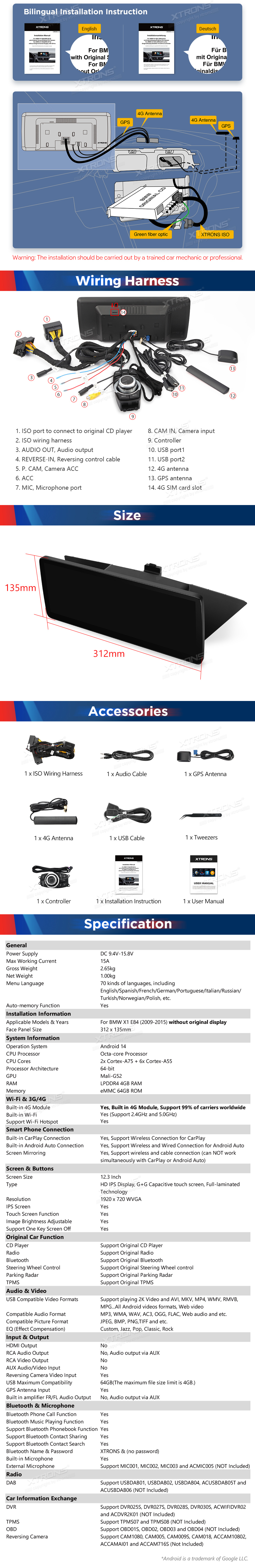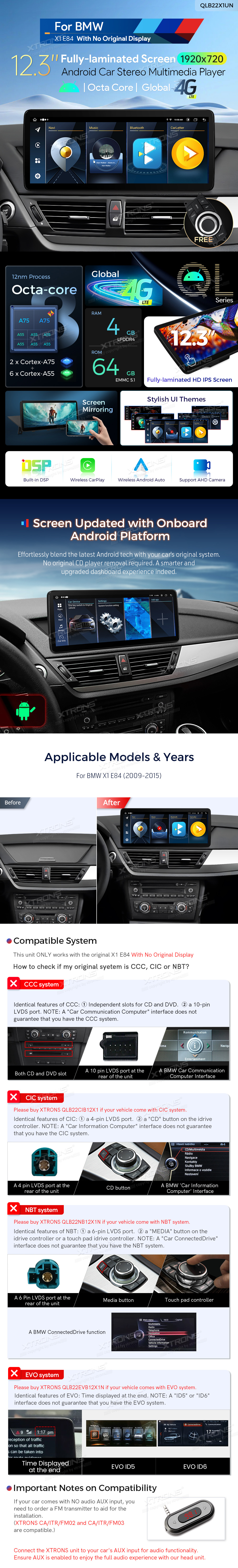 12.3" 4+64GB Octa Core Global 4G Fully-laminated Screen Android Car Stereo Multimedia Player for BMW X1 E84 With No Original Display