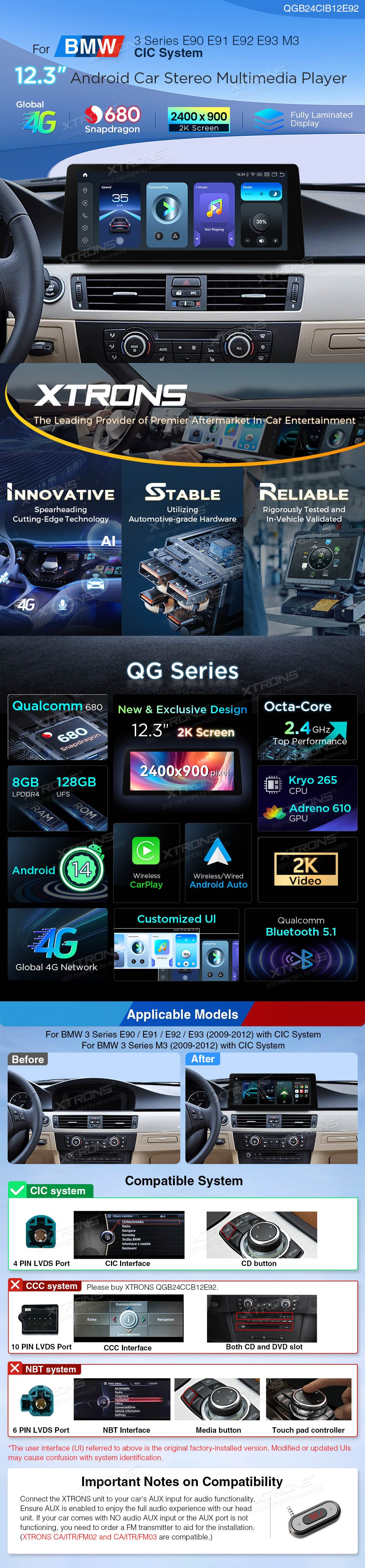 12.3 inch 8+128GB Snapdragon 680 2K Screen Global 4G Android Car Stereo Player for BMW 3 Series E90/E91/E92/E93/M3 (2009-2012) CIC