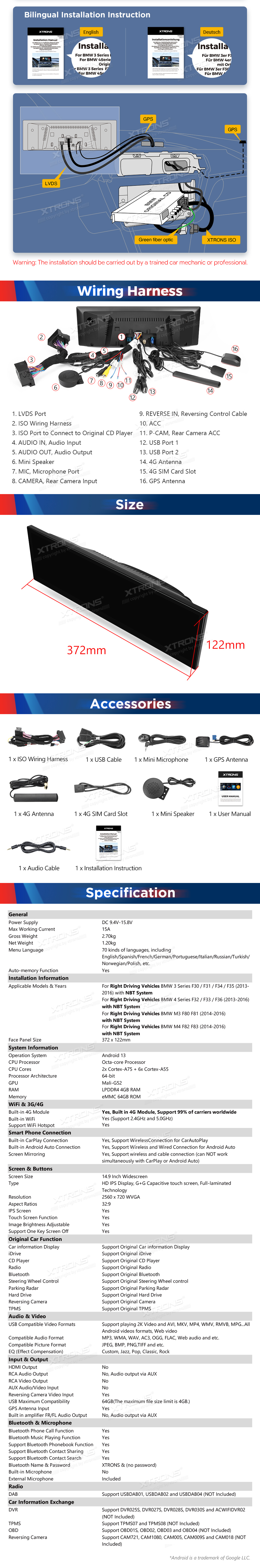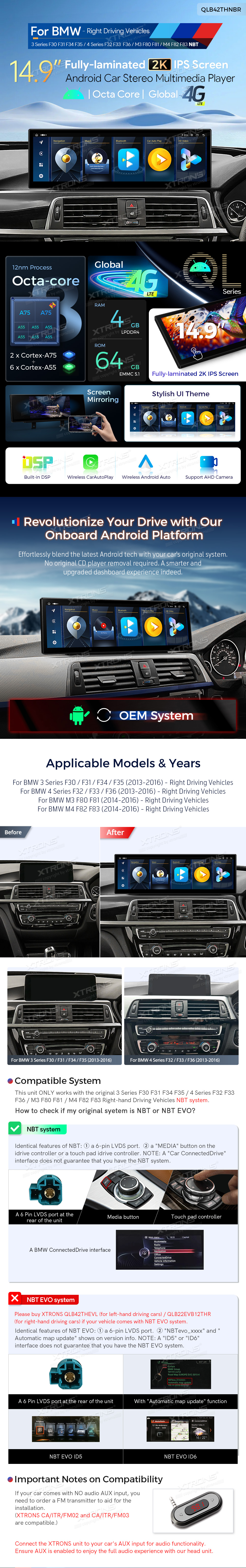14.9 inch Octa Core 4+64GB Global 4G LTE Android 14 Car Stereo Multimedia Player with Fully-laminated 2K IPS Screen for BMW 3 /4 Series M3/M4 NBT RHD