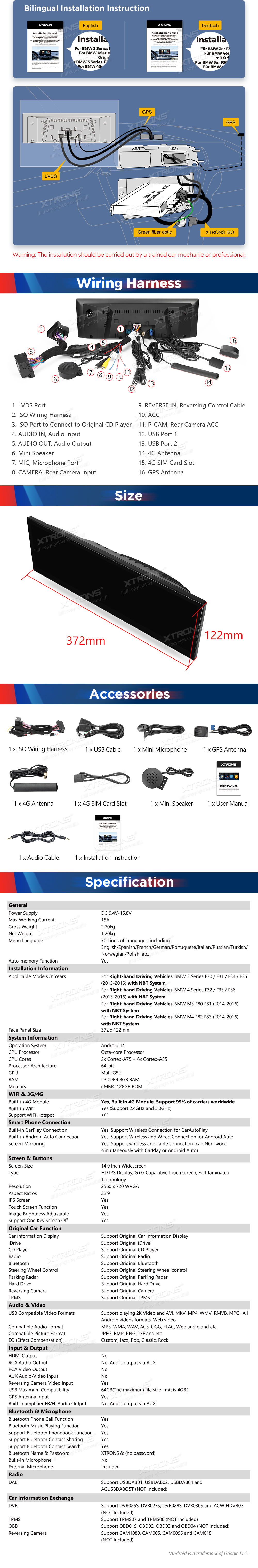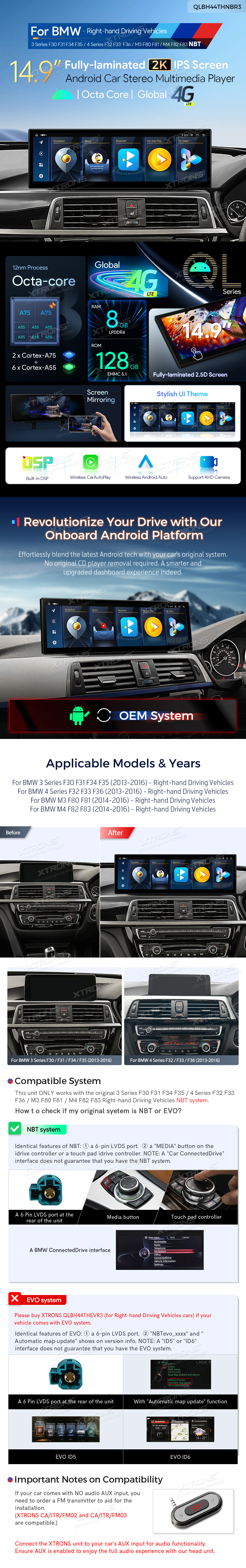 14.9 inch Octa Core 8+128GB Global 4G LTE Android Car Stereo Multimedia Player with Fully-laminated 2K IPS Screen for BMW 3/4 Series M3 M4 NBT RHD
