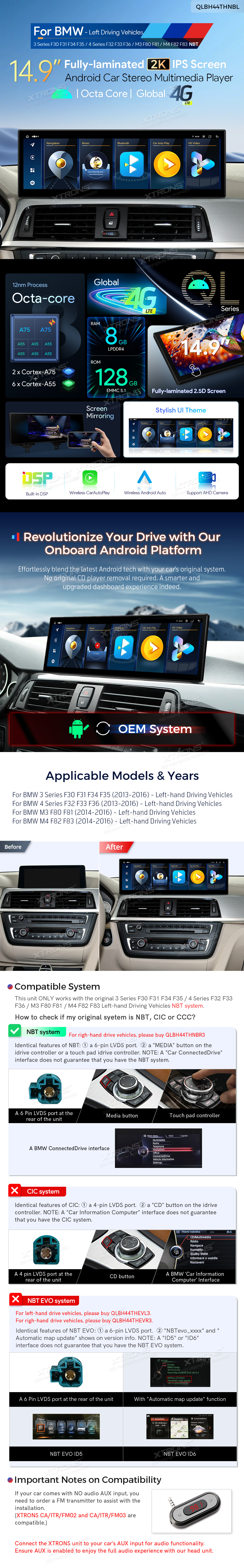 14.9 inch Octa Core 8+128GB Global 4G LTE Android Car Stereo Multimedia Player with Fully-laminated Screen for BMW 3 Series / 4 Series/M3/M4 NBT LHD