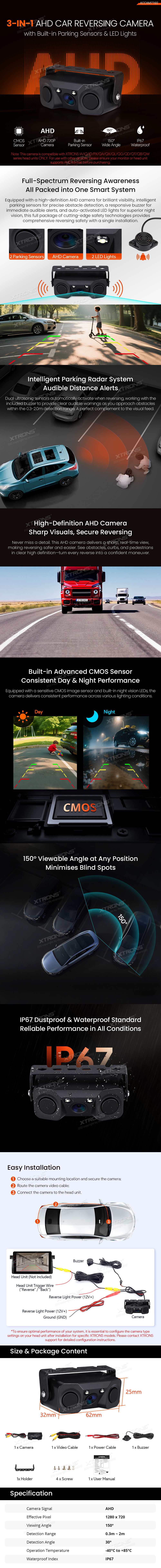 3-IN-1 AHD Car Reversing Camera with Built-in Parking Sensors & LED Lights