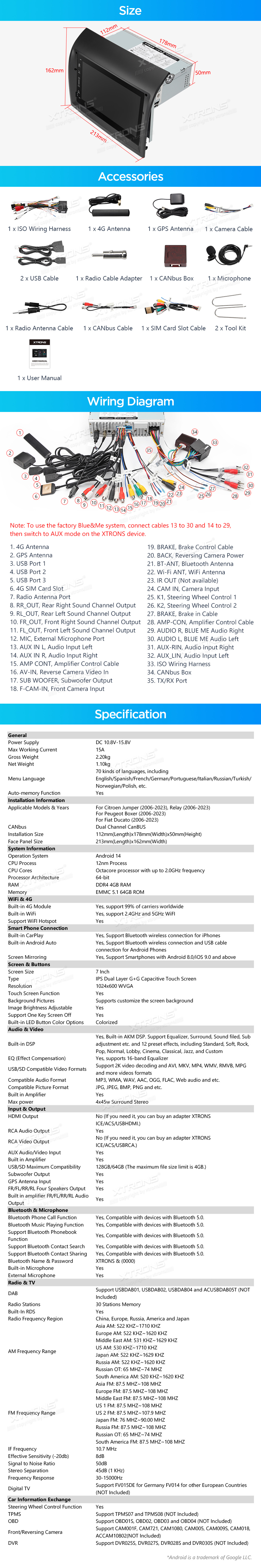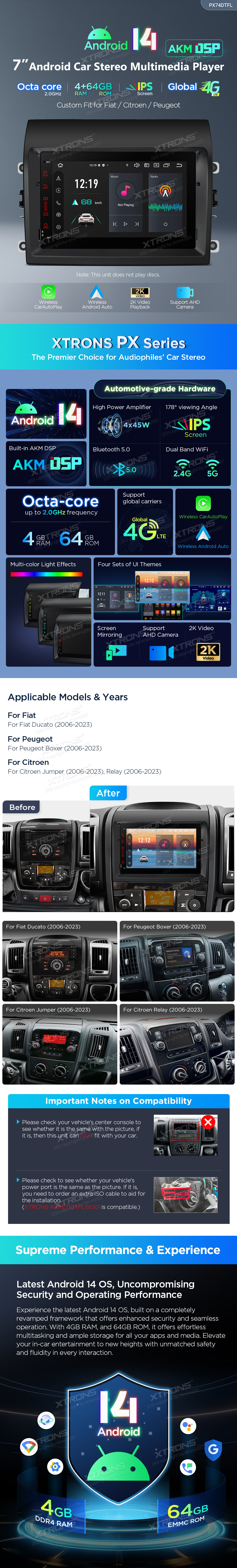 7 inch Octa Core 4+64GB Global 4G LTE Android 14 Car Stereo Multimedia Player Built-in DSP for Fiat/Peugeot/Citroen