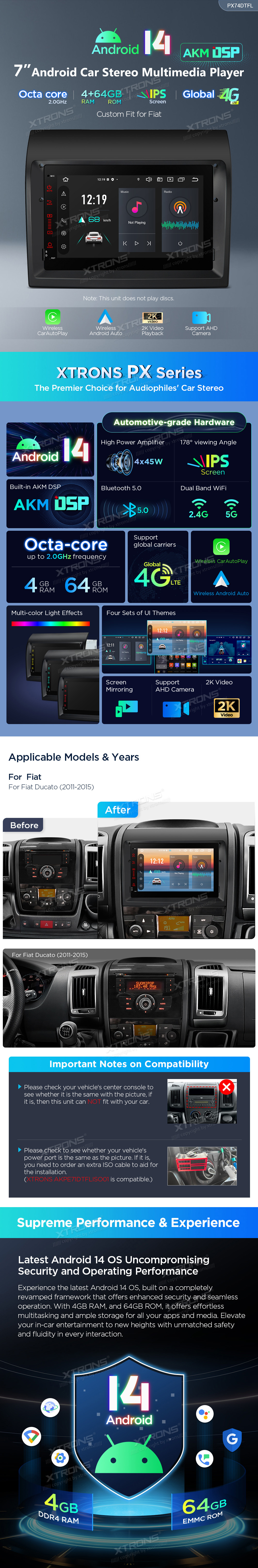 7 inch Octa Core 4+64GB Global 4G LTE Android 14 Car Stereo Multimedia Player Built-in DSP for Fiat